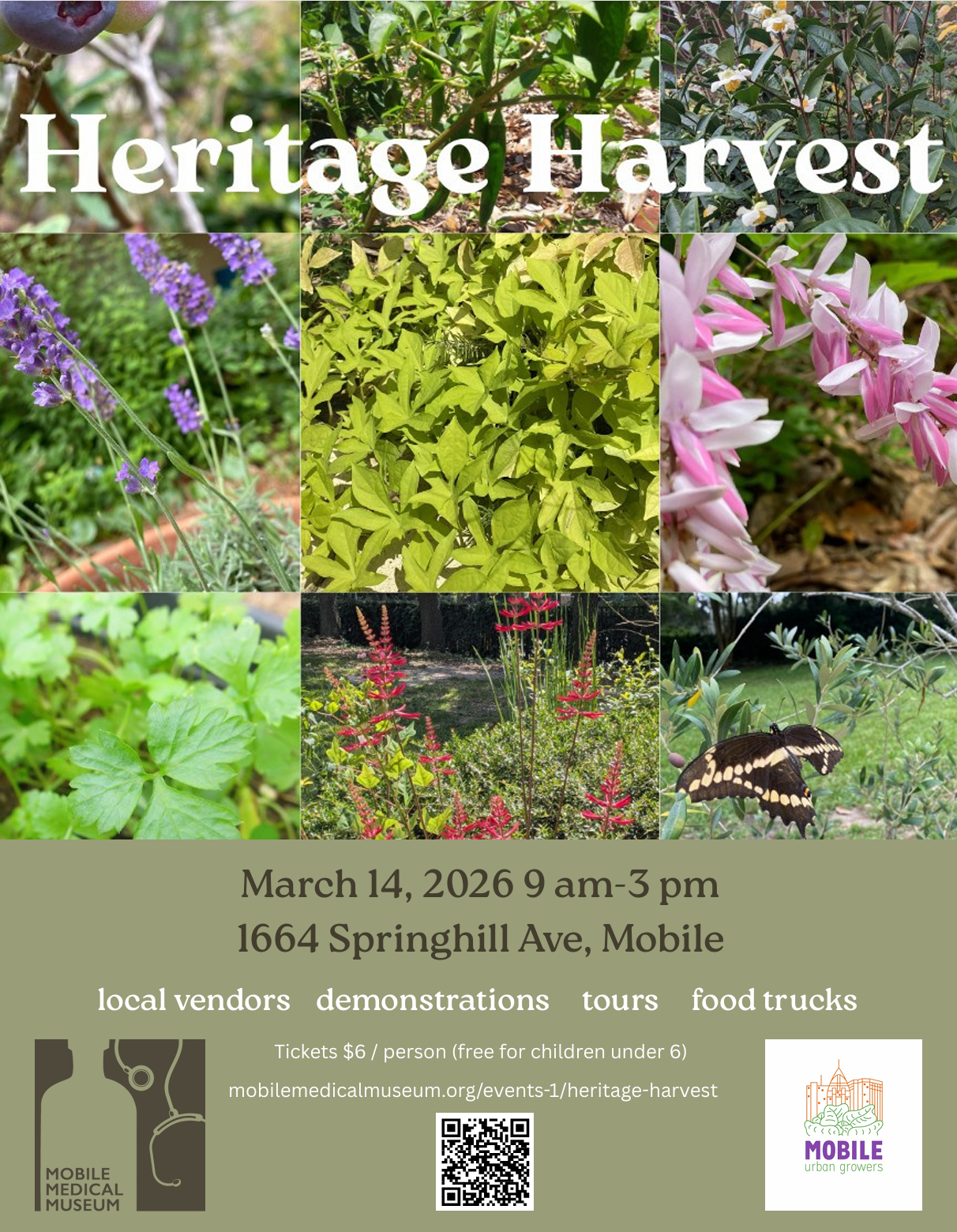 The Mobile Medical Museum and Mobile Urban Growers will hold the inaugural Heritage Harvest, a community event benefitting the Robert Thrower Medicinal Garden, Mobile’s first community garden dedicated to highlighting the history and current practices of herbal medicines around the world. Event activities will include a vendor market featuring locally made garden products, educational demonstrations on cultivation, crafting, and cooking, and tours of the Garden and Museum.